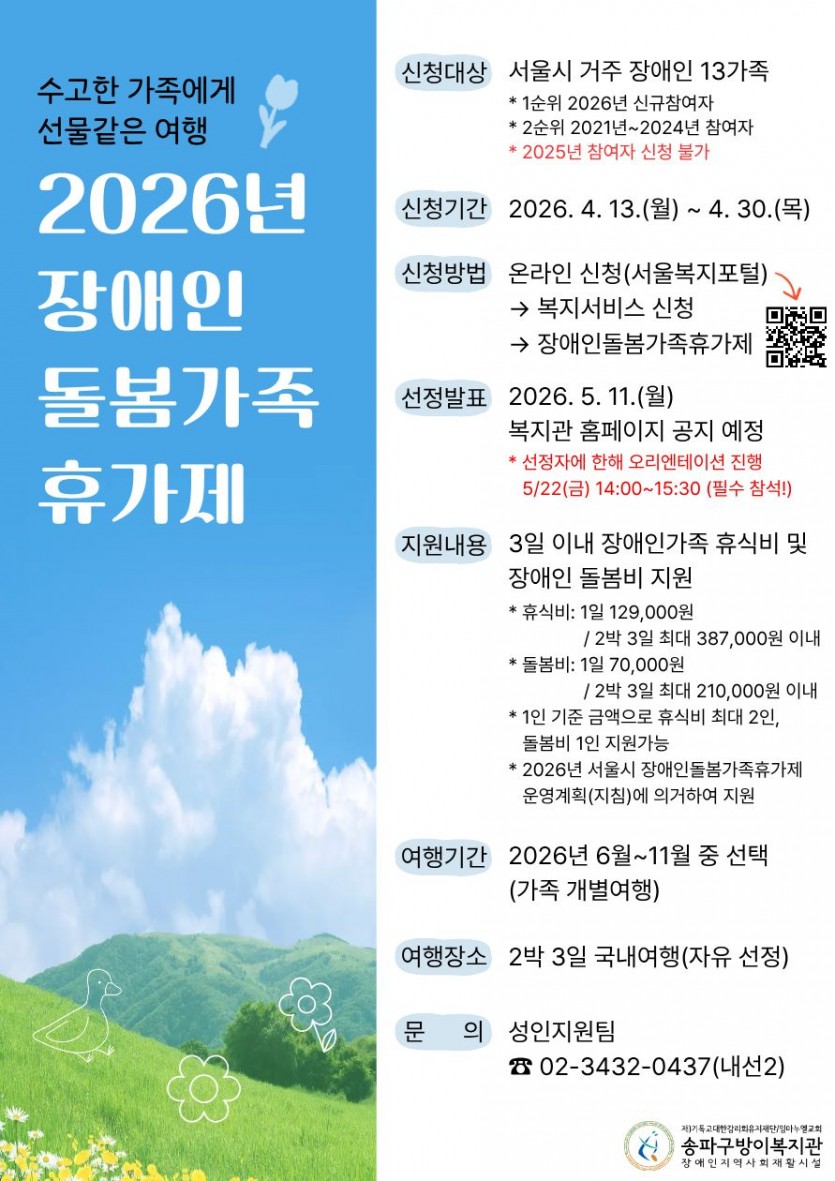 - 지원내용: 3일 이내 장애인 가족 휴식비(개별여행) 및 장애인 돌봄비 지원