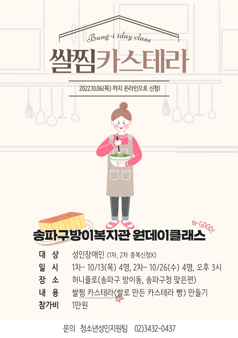이에 아래와 같이 10월에 진행 예정인 '쌀찜 카스테라 만들기' 원데이클래스 참여자를 모집합니다.