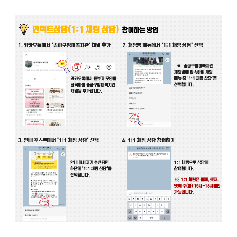 - 카카오플러스 1:1 채팅 상담 (‘송파구방이복지관 언택트상담’ 채널 추가)