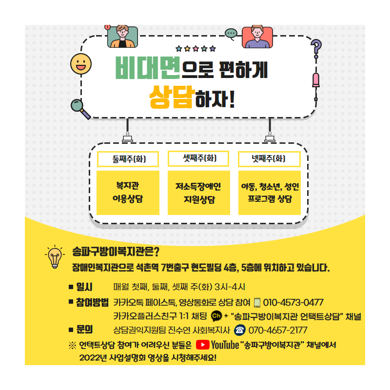 ※ 언택트상담 참여가 어려우신 분들은 유튜브 “송파구방이복지관” 채널에서 2022년 사업설명회 영상을 시청해주세요!