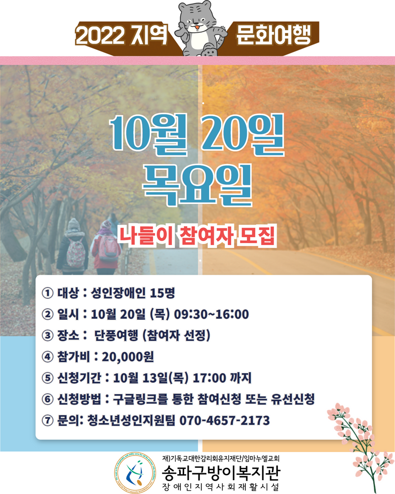 ① 대상 : 성인장애인 15명 ② 일시 : 10/20(목) 09:30~16:00 ③ 장소 : 단풍여행 (참여자 장소 선정) ④ 참가비 : 20,000원 ⑤ 신청기간 : 10월 13일(목) 18:00 까지 ⑥ 신청방법 : 구글링크를 통한 참여신청 또는 유선신청 ⑦ 문의: 청소년성인지원팀 070-4657-2173 신청링크 |