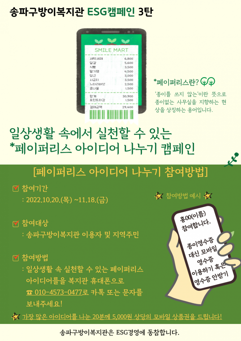 - 참여방법: 일상생활 속에서 실천할 수 있는 페이퍼리스 아이디어(예_모바일 영수증)를 복지관 휴대폰(☎010-4573-0477)으로 카톡 또는 문자를 보내주세요!