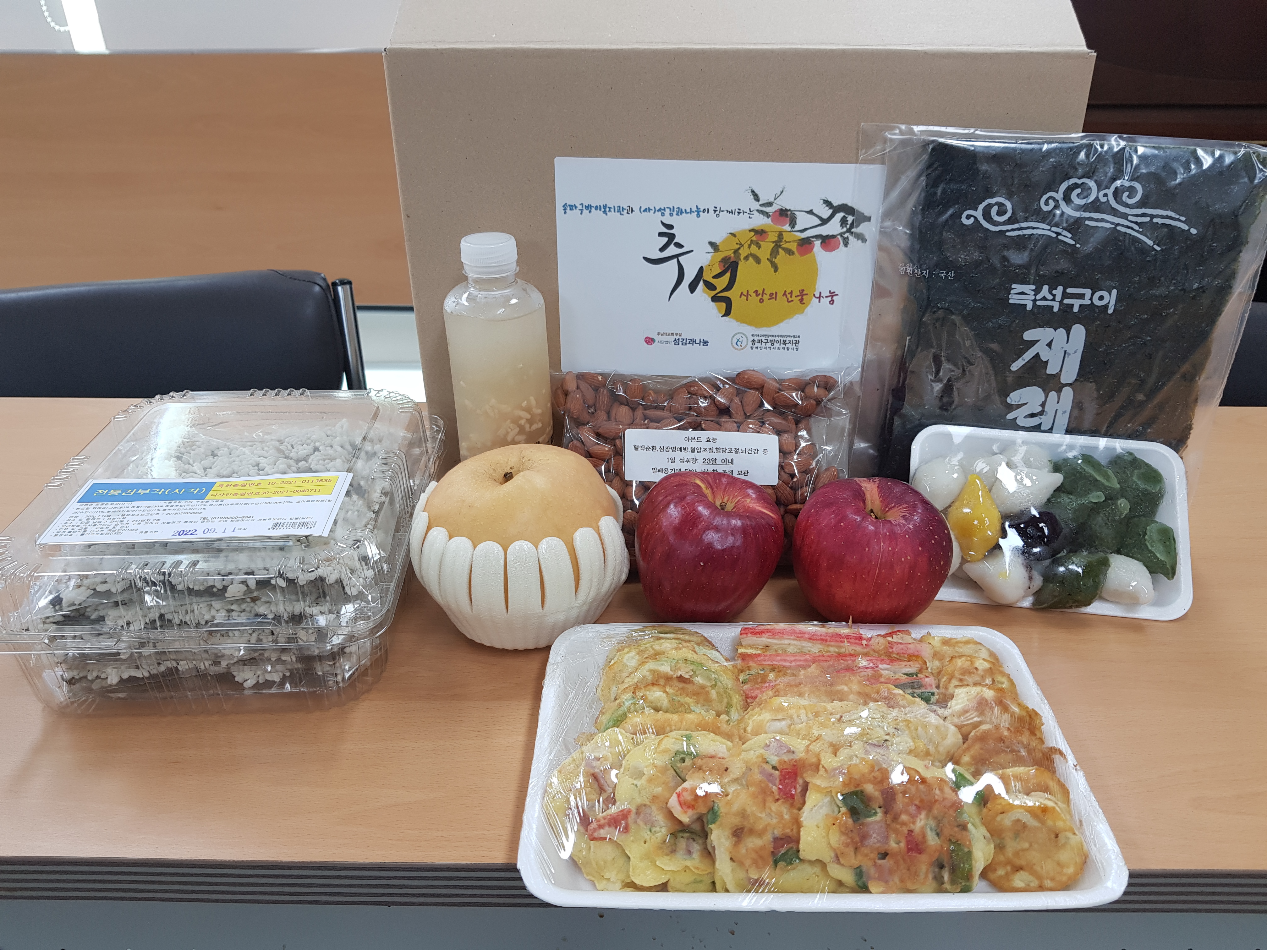 특히 올해는 다양한 지역사회 이웃들의 도움이 더해져 보다 알차고 풍성하게 사랑을 나눌 수 있었습니다.사단법인 섬김과나눔의 도움으로 각종 모듬 전과 송편, 식혜, 그리고 구운 김과 김부각, 견과류가 담긴 선물박스 총 125개를 마련할 수 있었습니다. 하나은행 방이동 지점의 후원이 더해져 추가 선물박스 25개와 함께 과일을 담을 수 있었습니다.