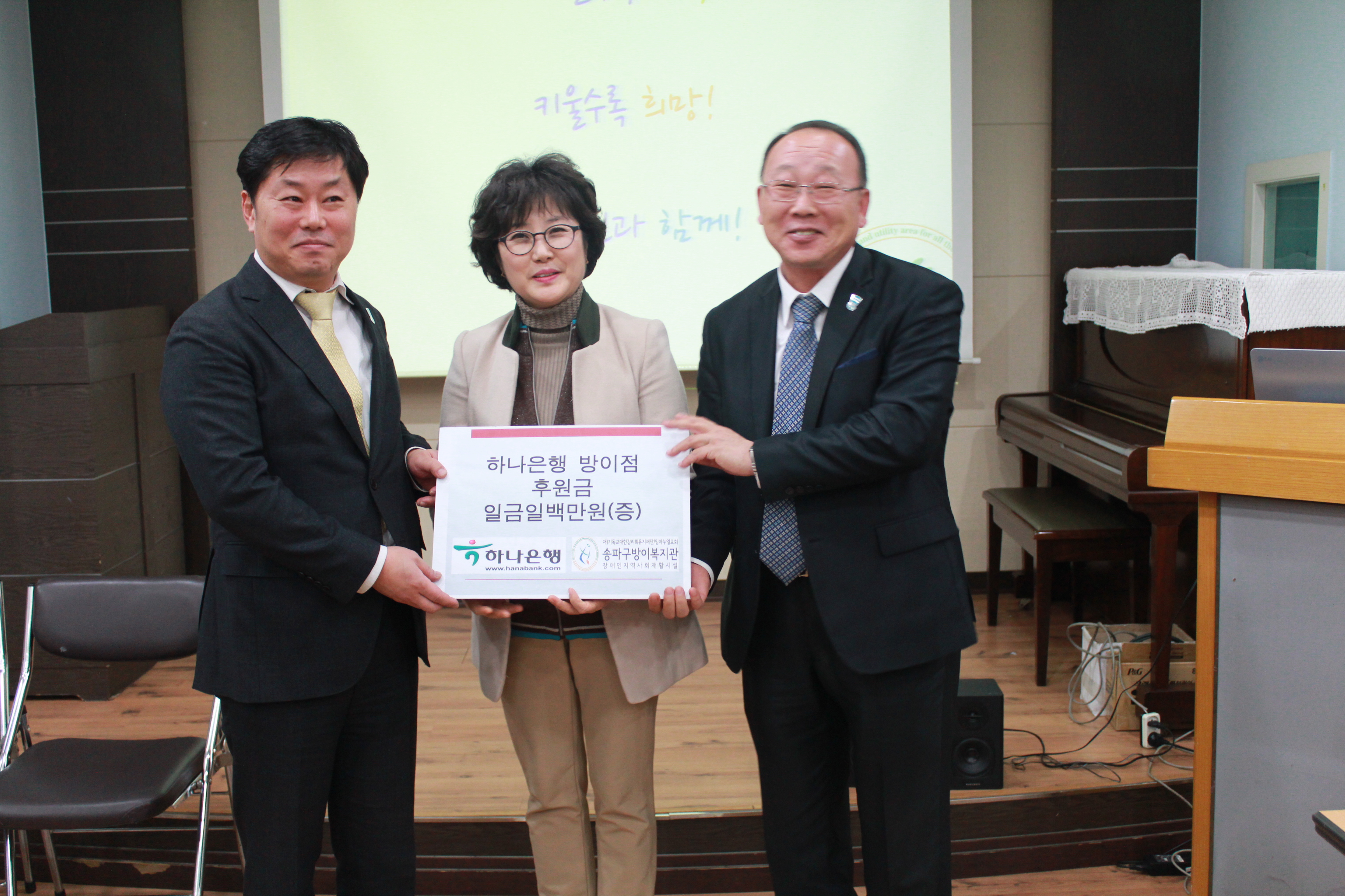 12월 3일(목) 19시부터 20시까지 송파구방이복지관 인근에 위치한 하나은행 방이점 지점장님을 비롯한 16명의 직원이 참석하여 후원금 전달 및 자원봉사활동을 하였습니다.