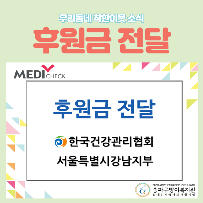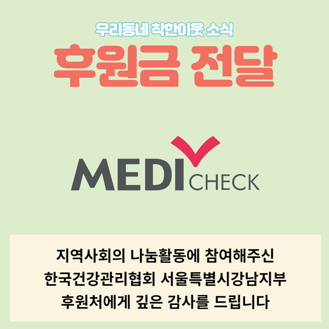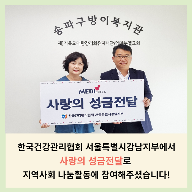 한국건강관리협회 서울특별시강남지부에서 후원금 전달을 통해 따뜻한 나눔활동에 참여해주셨습니다!