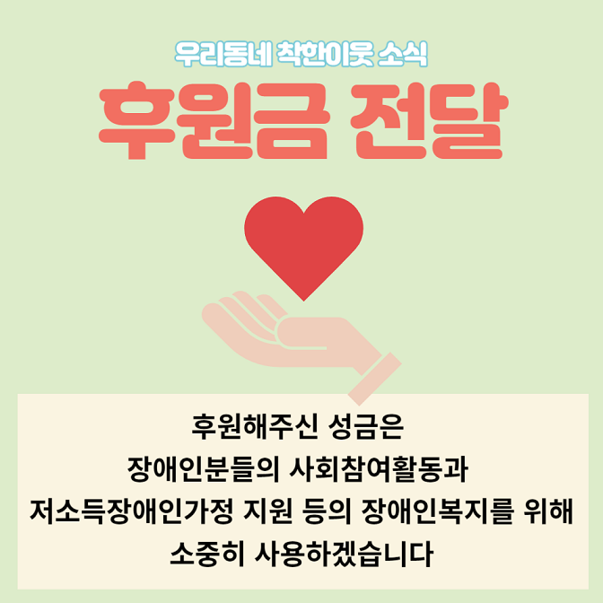 저소득장애인가정 지원 등의 장애인 복지를 위해 소중히 사용될 예정입니다.