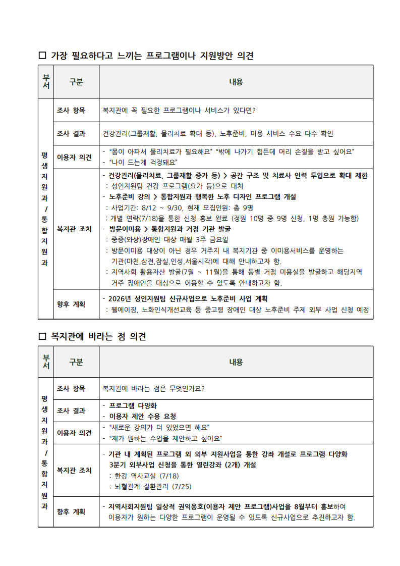 위의 내용으로 조사가 진행되었습니다. 의견조사(욕구조사) 결과와 관련 조치 결과에 대해서 지역주민분들과 이용자 여러분들께 공유드립니다.