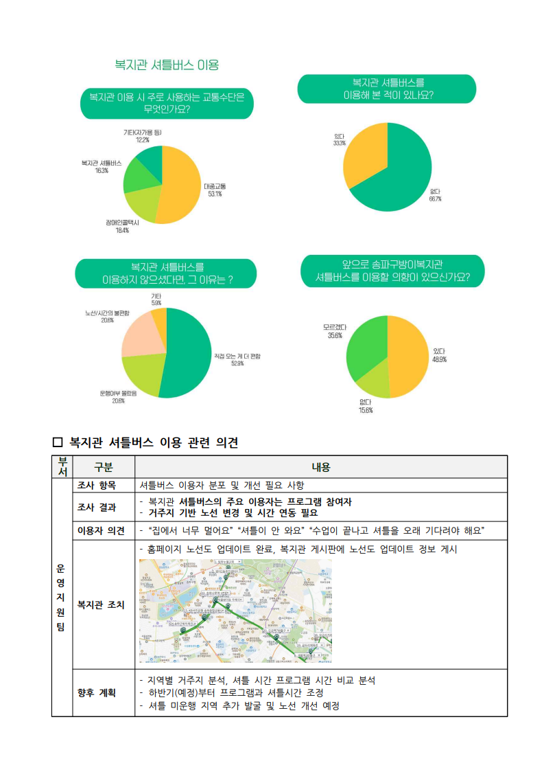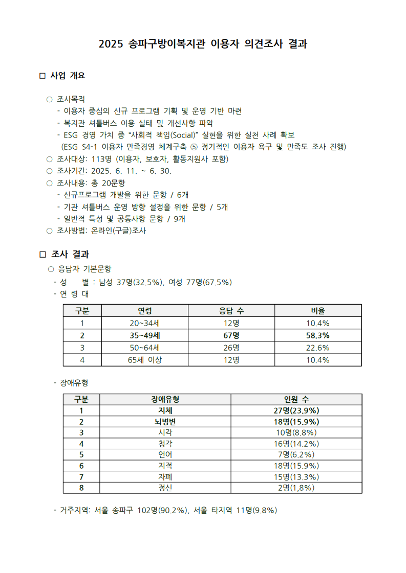 이번 의견조사는 이용자 중심의 신규 프로그램 기획 및 운영 기반 마련과 복지관 셔틀버스 이용 실태 및 개선사항 파악, ESG 경영 S4-1 이용자 만족경영 체계구축의 목적으로