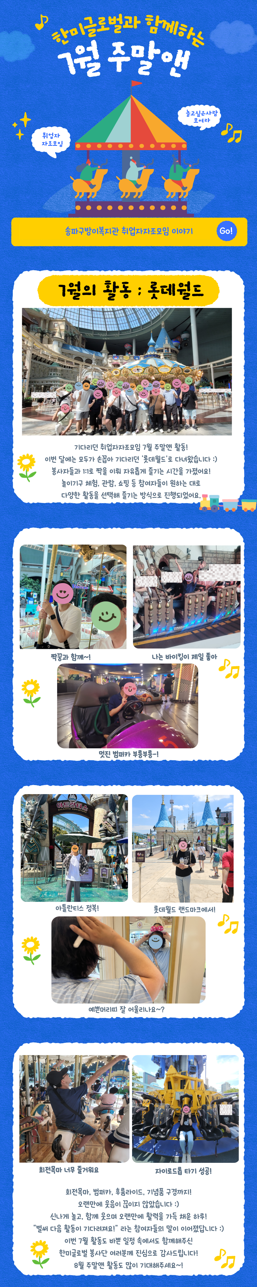 이번 활동은 정해진 일정 없이, 놀이기구 체험, 관람, 쇼핑 등 참여자들이 원하는 대로 다양한 활동을 선택해 즐기는 방식으로 진행되었어요.